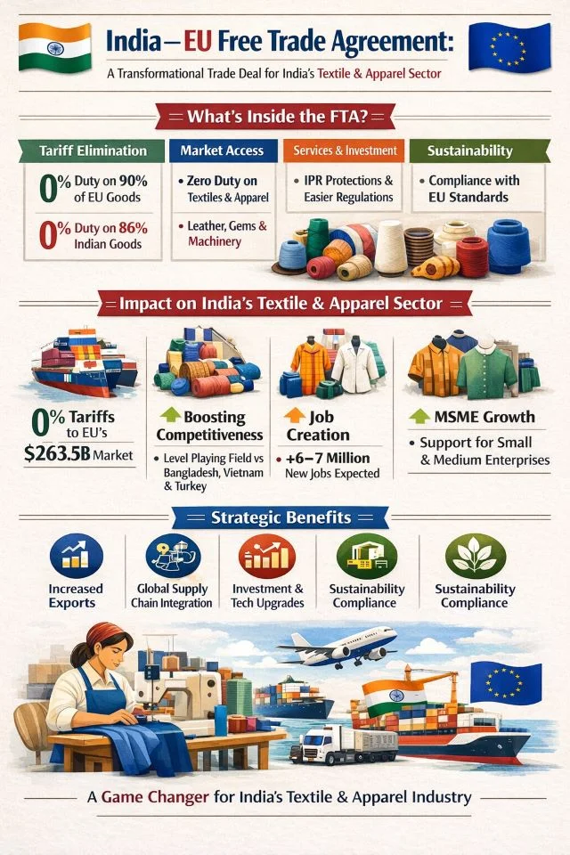 India–EU Free Trade Agreement is a transformative deal for India’s textile and apparel sector, under which tariffs will be eliminated on about 90% of EU goods and 86% of Indian goods, including zero-duty access for textiles and apparel as well as products such as leather, gems and machinery, alongside stronger intellectual property protection, easier regulations and compliance with EU sustainability standards. The agreement will give Indian exporters zero-tariff access to the EU’s USD 263.5 billion textile and apparel market, boost competitiveness by creating a level playing field, and is expected to create around 6–7 million new jobs. Strategically, it will increase exports, deepen global supply chain integration, attract investment and technology upgrades, and strengthen sustainability compliance, making it a game-changer for India’s textile and apparel industry.